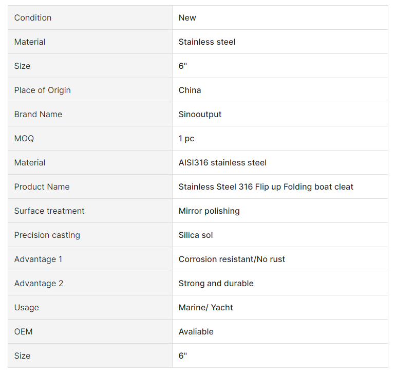6 inch Marine boat Stainless Steel 316 Flip up Folding boat cleat